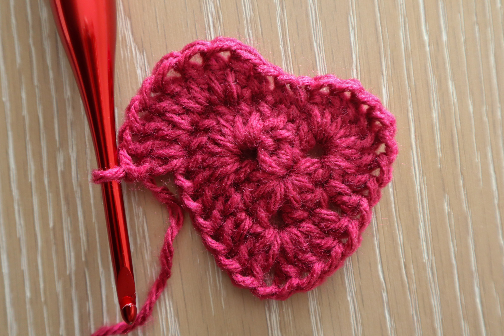Work 1dc in each stitch along the side of the heart. Into the first top ch2 corner, work 2dc, ch2, 1dc.