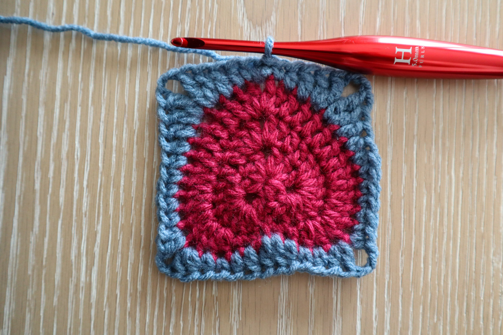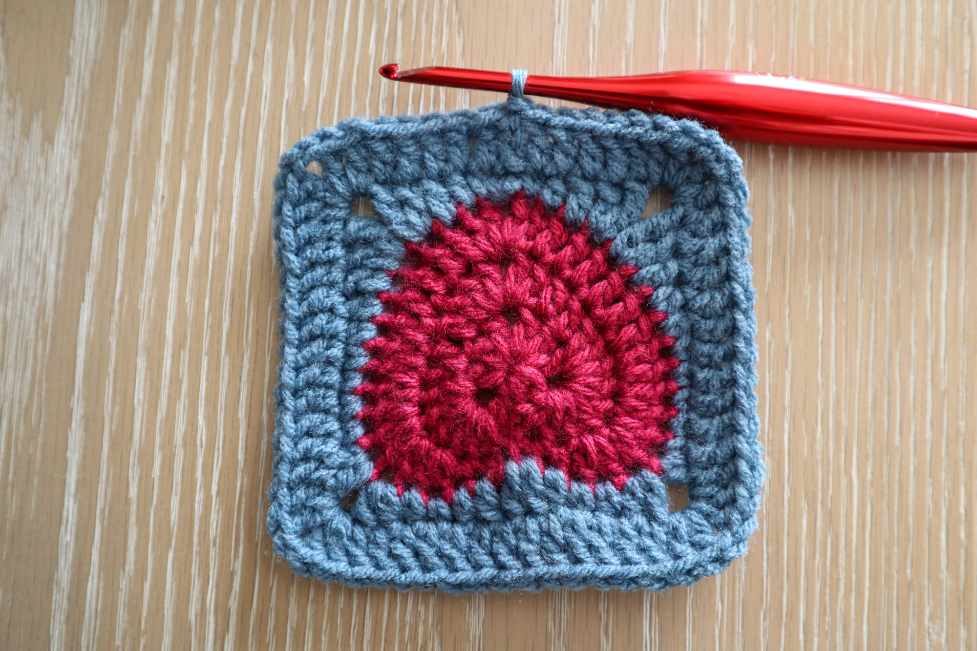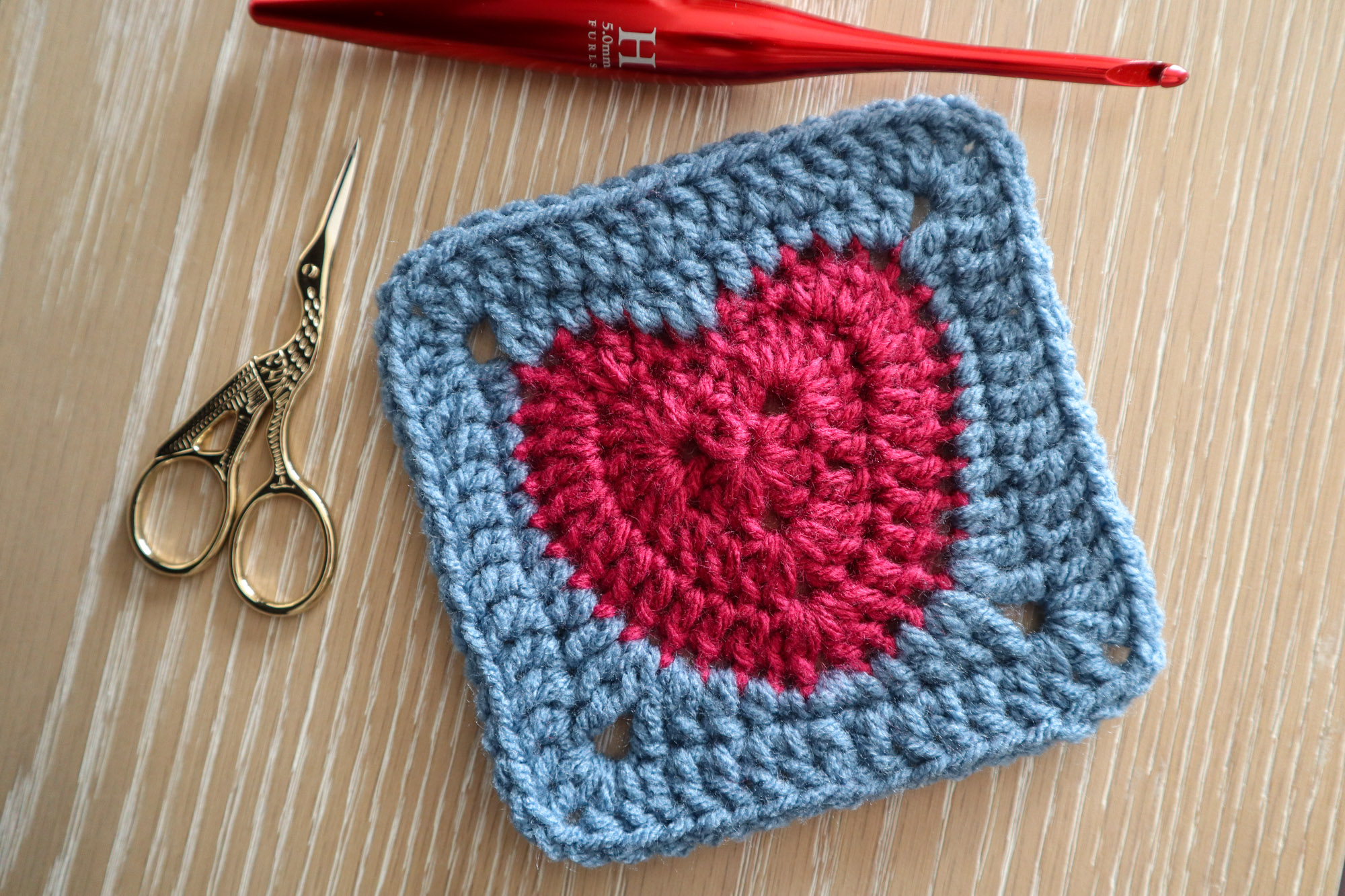 Intermediate — While this granny square only uses basic stitches (single crochet, double crochet, treble crochet, chains and slip stitches), it does require you to have a good handle on counting your stitches and keeping track of where to put them.