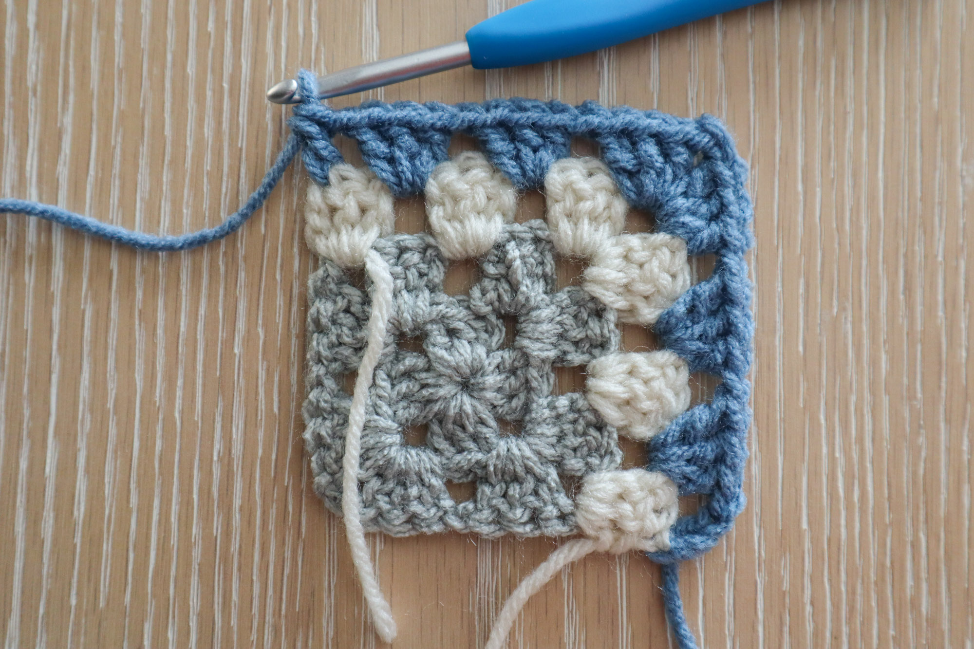 Fasten on a new color in any ch3 corner. Ch3 (counts as 1dc) and make 2 more dc into the corner. Ch1, 3dc in the next ch1 space. Ch1. 3dc, ch2, 3dc all into the next corner ch2 space. Ch1, 3dc in next ch1 space. ch1, 3dc in next ch2 space.