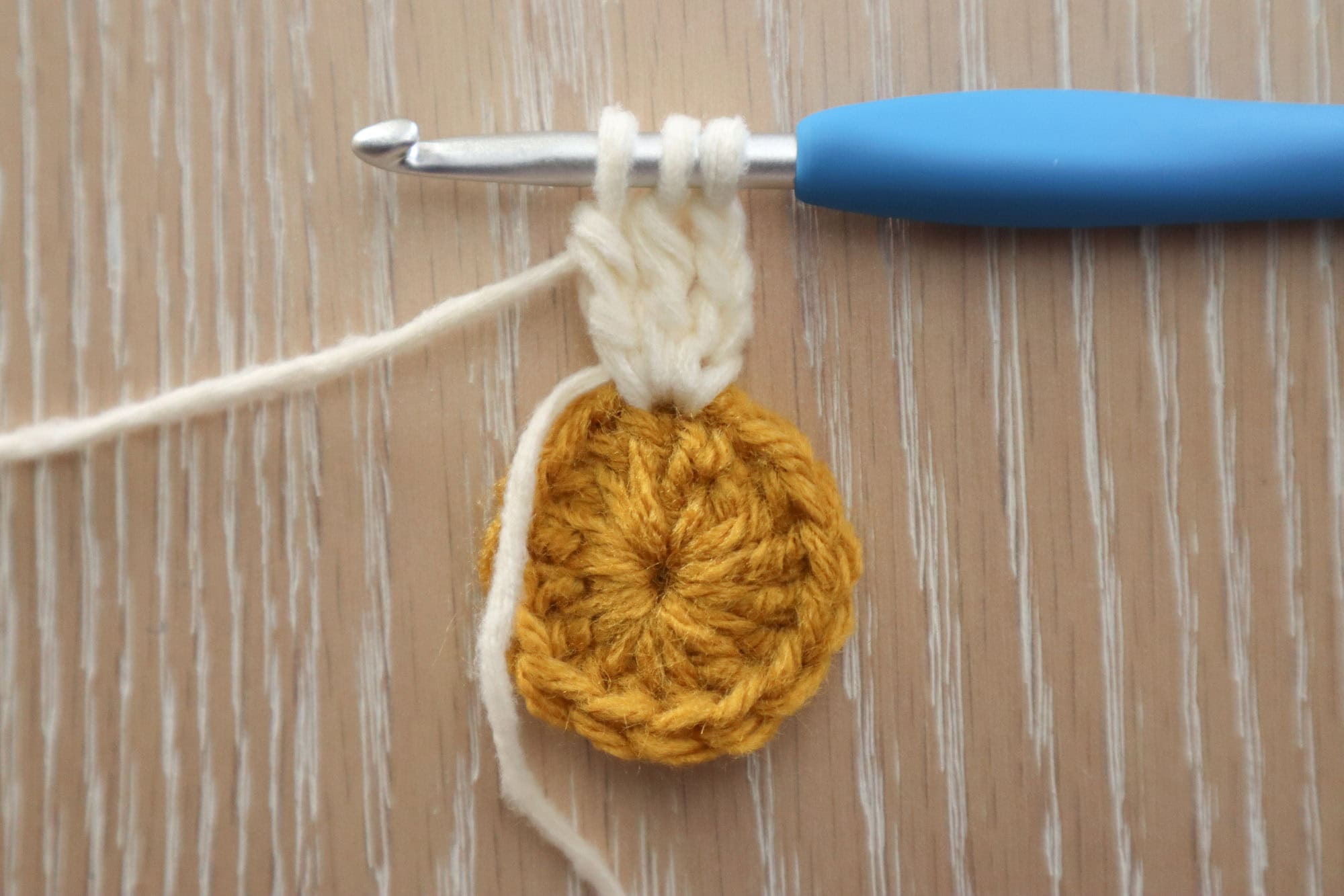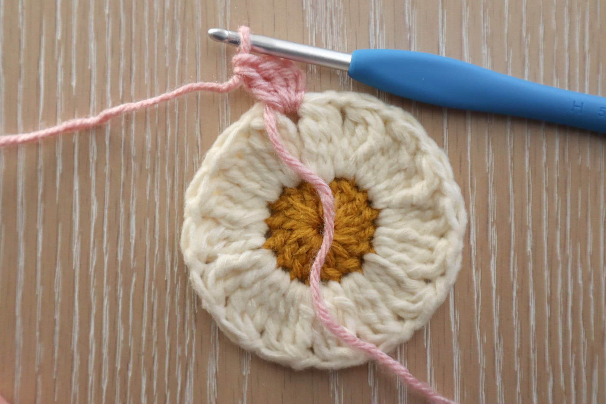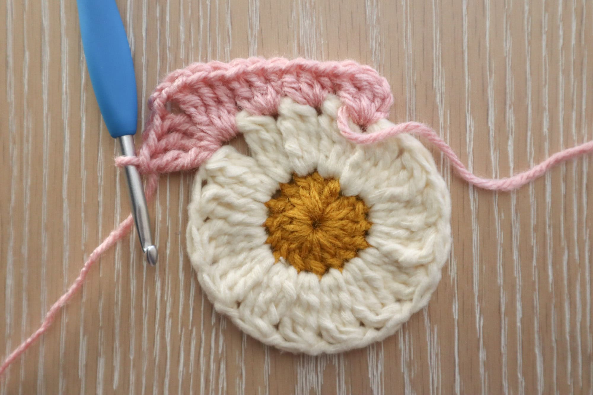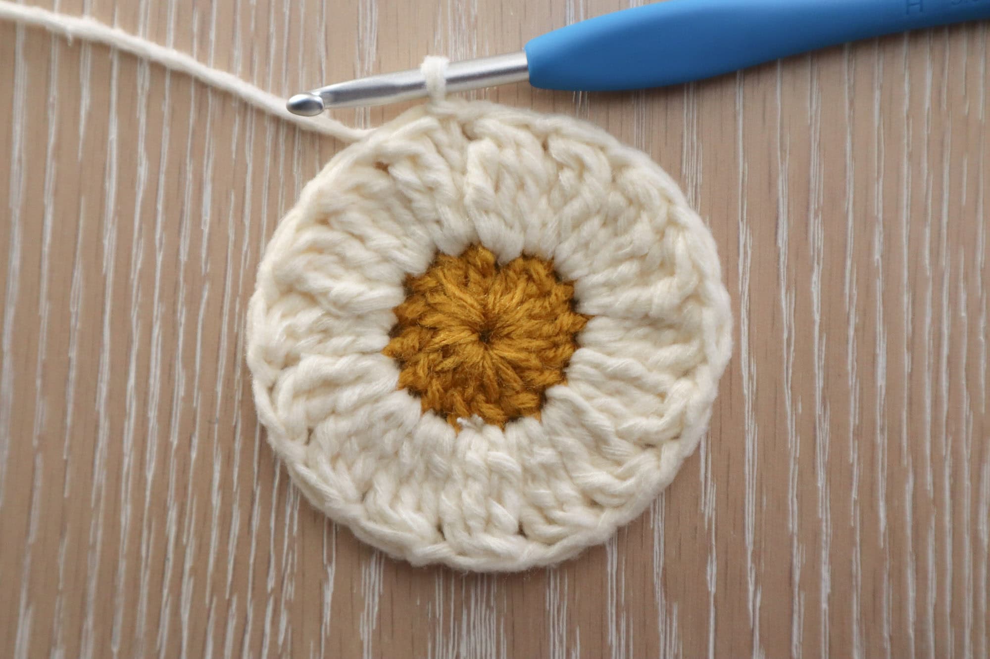 In daisy center color, ch4, sl st to the first ch to create a ch4 ring. Alternatively, you could make a magic circle.