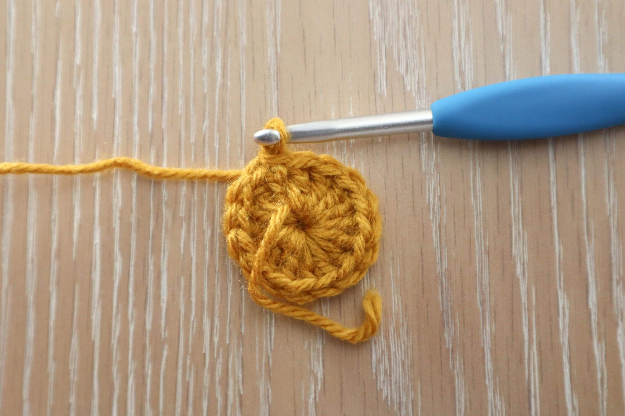 In flower center color, ch3 (counts as 1dc) and work 15 more dc into the ch4 ring. Sl st to the top of your starting ch3 to complete the rnd. (16dc)