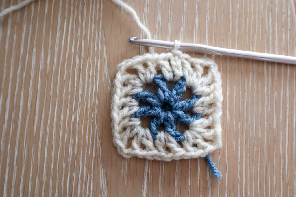 Fasten off color 1, fasten on color 2 in the next ch1 sp. Ch4 (counts as 1dc, ch1) and work 1dc in the same space (first v-stitch). *Without chaining, work 1dc, ch1, 1dc in the next chain 2 space. Ch2, and work another v-stitch in the same space. Without chaining, work 1 v-stitch in the next ch1 space.* Repeat between ** 2 more times. Work another v-stitch, ch2, v-stitch in the last ch2 sp. Sl st to the third chain of your starting ch4 to complete the rnd. (12 v-stitches, 4 ch2 corner spaces)